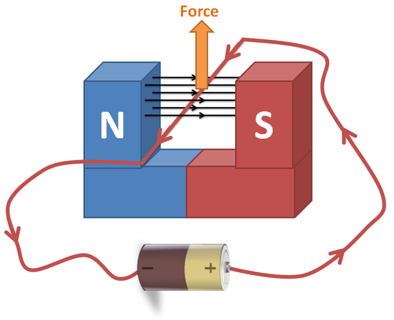 When a current passes through a conductor in a magnetic field, the conductor experiences a force.