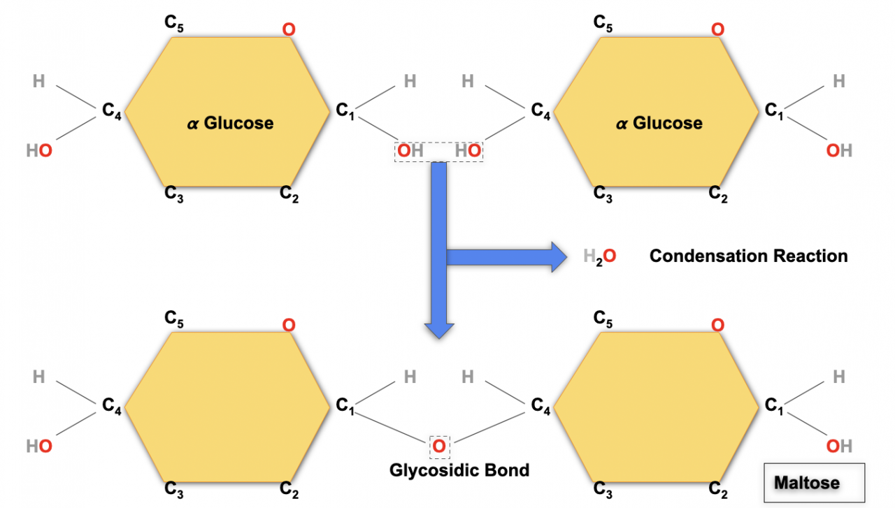 These have molecules made up of two monosaccharide molecules joined by a glycosidic bond. Examples include Maltose, Sucrose and Lactose. Maltose is shown in the image above. It is made of two alpha glucose molecules, each with the formula C6H12O6 . A molecule of water is lost as the glycosidic bond between the two glucose molecules forms, making its chemical formula C12H22O11