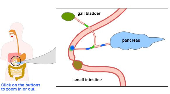 The partly digested food exits the stomach and enters the small intestine. In the first part of the small intestine bile, from the gall bladder, and pancreatic juices , from the pancreas, are added.