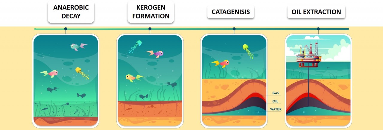 Ancient marine animals trapped in sedimentary rocks millions of years ago decomposed to form a mixture of hydrocarbons known as crude oil. Crude oil is found in underground reservoirs, trapped in rock formations. It is pumped up to the surface before being refined.