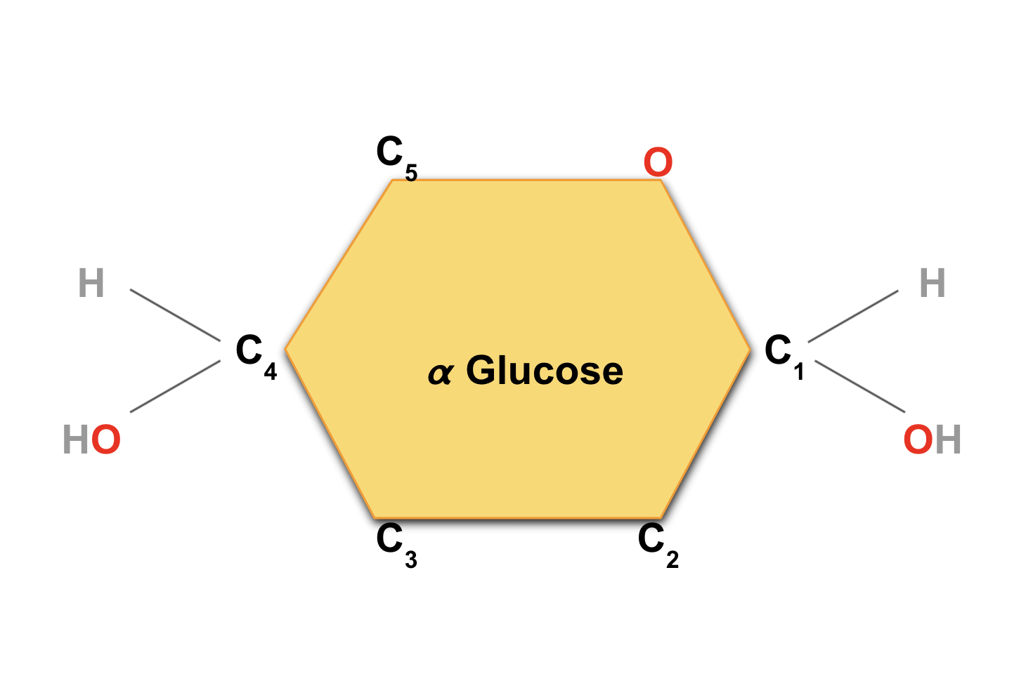 These are single units of carbohydrates, sometimes commonly referred to as 'simple sugars.' Examples include, glucose, fructose and galactose. These three are hexose sugars with the chemical formula C6H12O6. This diagram is of alpha glucose. For simplification, only 5 of the carbons and only the OH and H groups around carbon 1 and 4 are shown in this diagram.