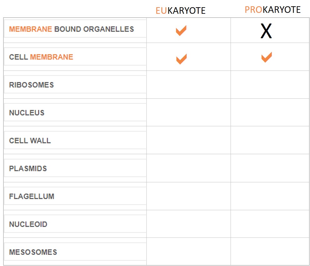 - Write two columns 'Eukaryotic' and 'Prokaryotic' and see if you can put the components in the correct columns BEFORE you click for your answer.