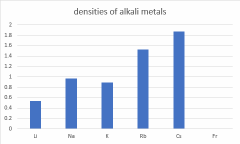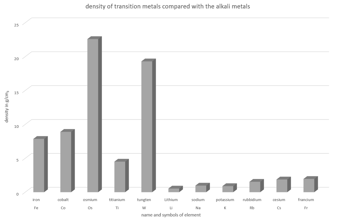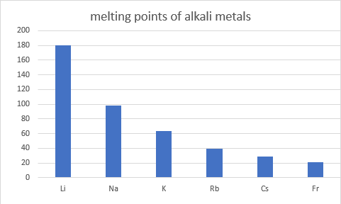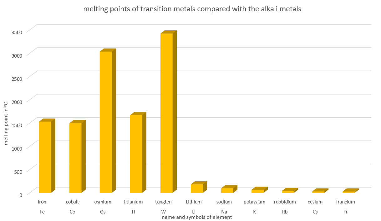 All of the alkali metals appear to have a lower melting point than all of the transition metals ** we have looked at so far. On average, from the data given, then transition metals have an average melting point of 2152oC, And the alkali metals have an average melting point of 72oC.