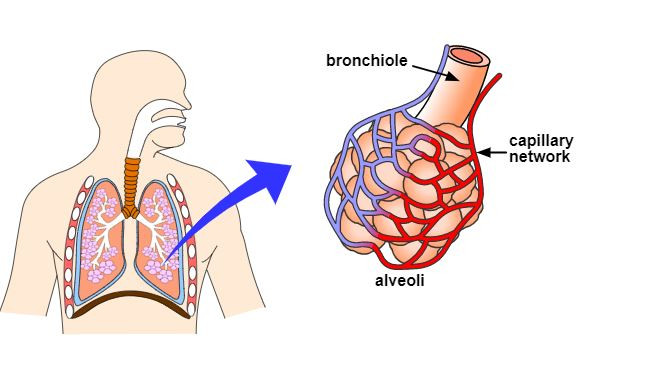 Oxygen moves from the inside of the alveolus into the blood and attaches to the haemoglobin of the red blood cells. It moves by a process called diffusion.