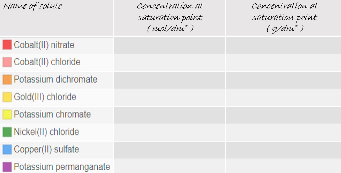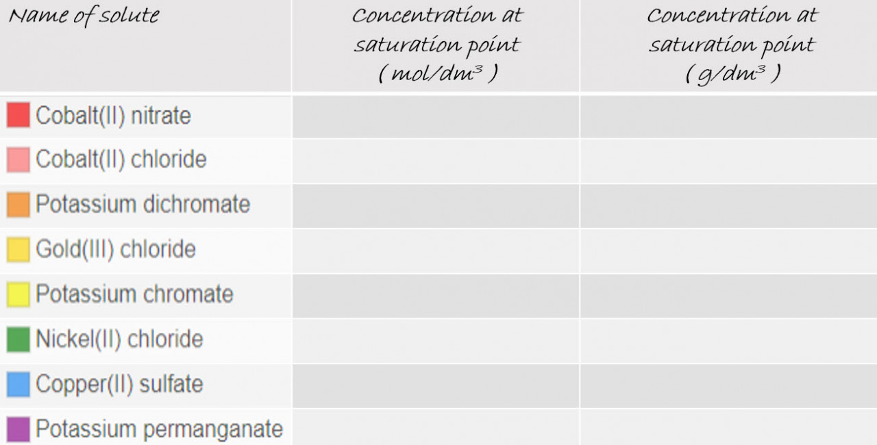 Use the animation below to find out the concentration ( in Mol/dm3)at which each solute forms a saturated solution.
