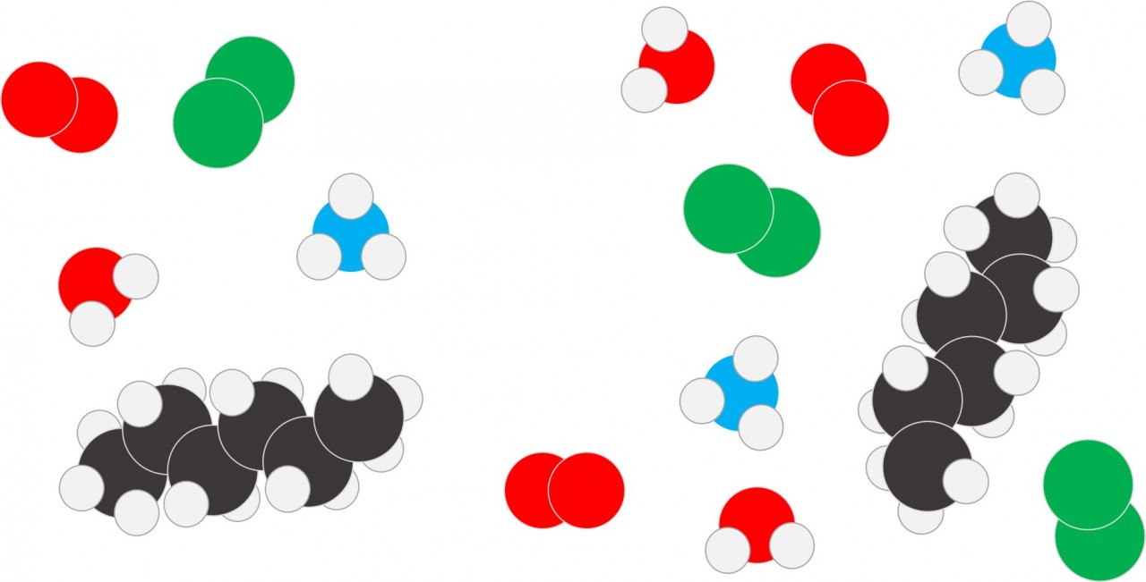The atoms in a molecule might all be of the same element eg Hydrogen (H2) or Oxygen (O2) . When a molecule contains atoms of different elements it is a compound e.g. Water (H2O) or Methane (CH4).