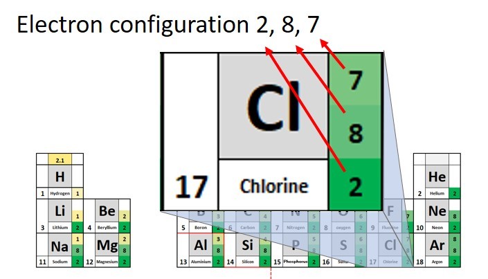 Chlorine has an atomic number of 17. This means that the atoms have 17 protons. Because atoms have no overall charge the number of electrons must also be 17. These are arranged as follows: