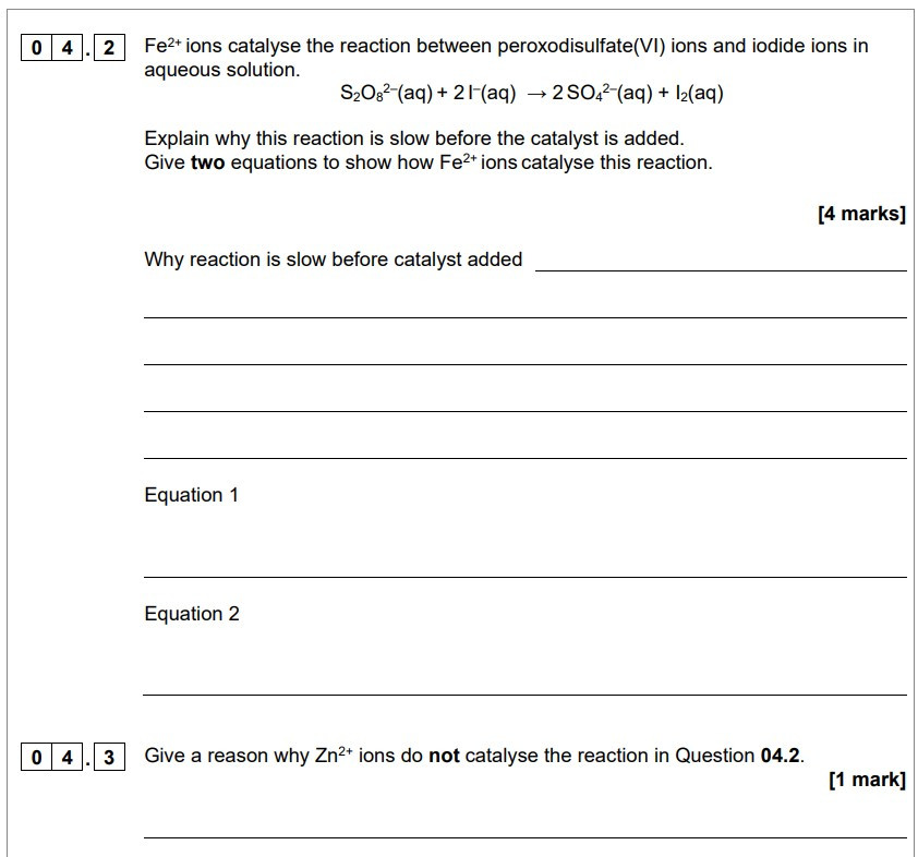 The iodine clock reaction is a classic reaction which can be used to compare the initial rate of a reaction.There are two reactions taking place simultaneously in the solution. Both are redox reactions: